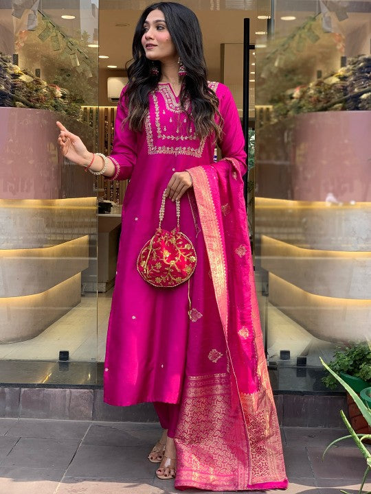 EKRIA Fuchsia Silk Embroidered Suit Set with Banarasi Dupatta